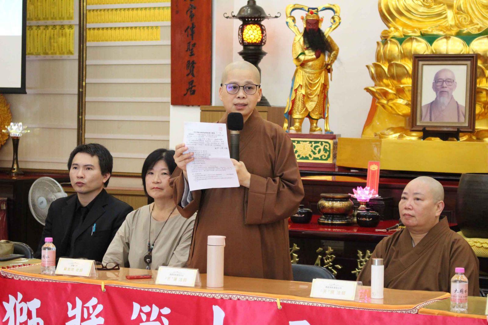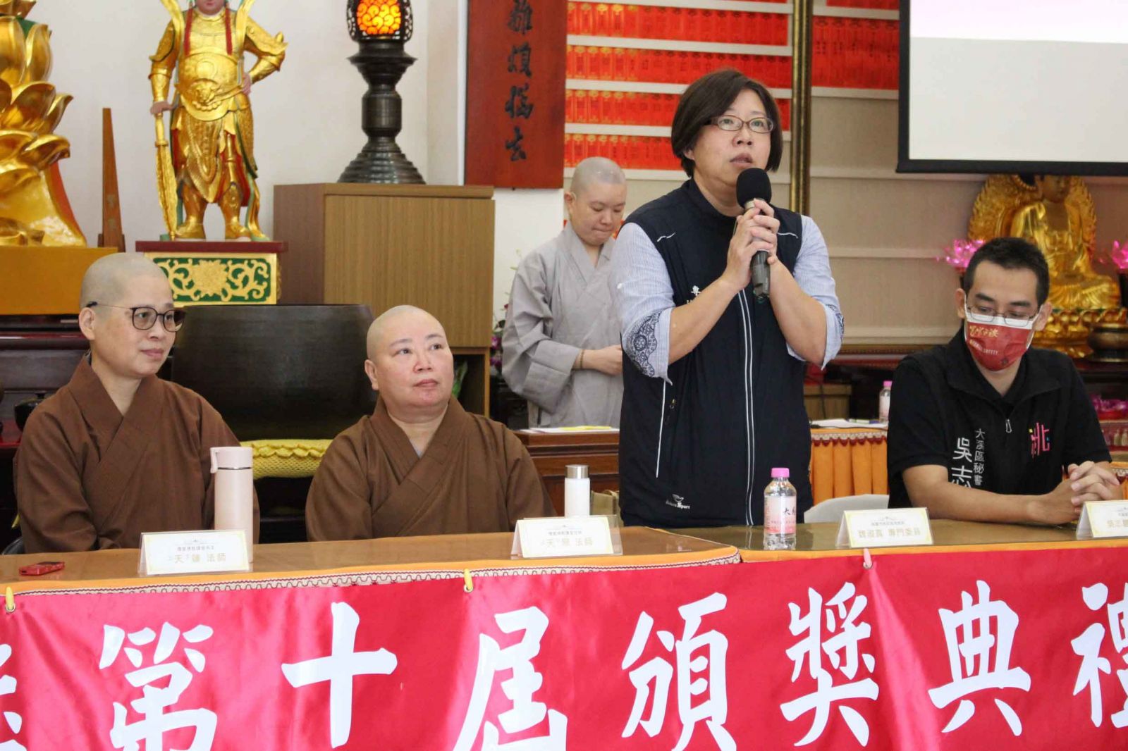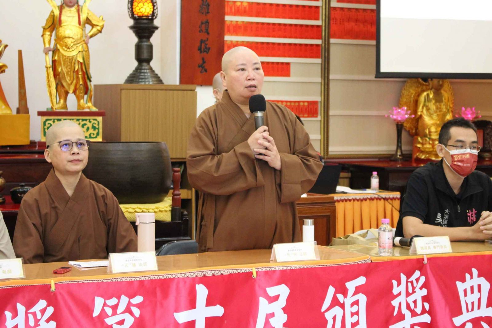 桃園市民政局魏淑真專門委員,代表張善政市長表達對僑愛佛教講堂的關愛,他讚賞講堂長期於文化及地方社區發展上所付出的努力,期望佛堂在未來能繼續發揮宗教向善之力量。秉持佛陀的教法,為弘法利生的付出而努力亦表達萬分謝意。期望有更多的民眾在正信道場,獲收法益,讓宗教來和諧社會祥和人心,及廣結善緣。評審老師徐銘謙致詞感慨的說:我本身在大學教授國文,當今學生的文章總是辭不達義,或是錯字一堆,使我們教授難以想像。沒想到評審金獅獎文章真是深感意外,筆者沒有AI借入,文筆流暢含意深遠,內容淵博,有總豁然開朗之感,才思敏捷文從字順,審稿之餘覺得在此獎項中又見到文學未來的希望。評審蘇美玲老師代表書法類致詞,書法在於筆與神運,書藝方能得心。軒冕不能移,貧賤不能屈,浩然得心,以終其身乃書法之大局。寫字以氣為主;字字皆有骨肉筋血,以氣充之,如此精神乃出。恭喜得獎者,於書法學習中獲一張耀眼的成績單。此榮譽更多的是參賽過程,透過不斷的修正與省思自己的作品,從中所獲得乃自信與成長。書法是中華文明最重要亦最精采的部分,期望大家皆能在此領域繼續堅持向前。