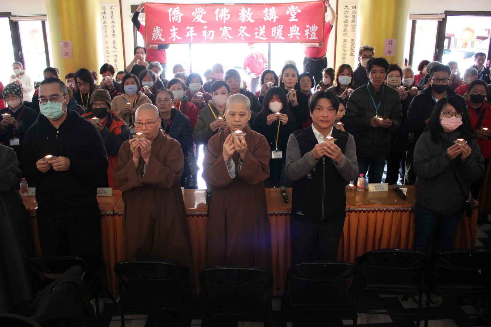 桃園大溪僑愛佛教講堂於114年12月22日至12月28日舉行歲末年終華嚴佛七,法會每日七支香,前一天下午舉辦灑淨儀式,為修行者資糧多加把勁,藉由佛七再補足它。28日上午10點,於大殿舉行今年寒冬送暖活動,受贈安排30戶,當日領取27戶。典禮開始常住僧眾帶領全體與會大眾點燈祈福,願天下無災無難。「華嚴佛七」非專稱念佛陀聖號為主,為成就道業華嚴弟子編出實踐的華嚴念佛法門,華嚴佛七有唱誦佛號及拜願、懺悔、迴向等。說到念佛法門緣於頻婆娑羅王及韋提希夫人被自己兒子阿闍世幽閉於大牢,身心痛苦,歎娑婆世間之罪孽堪苦難受。遙請釋迦佛陀為其夫婦開示解脫法門,告知;可以依念佛方式求得一心不亂,證得念佛三昧得大自在。