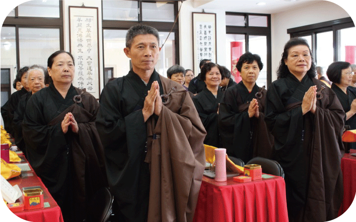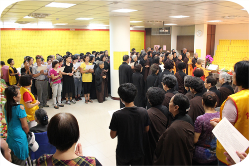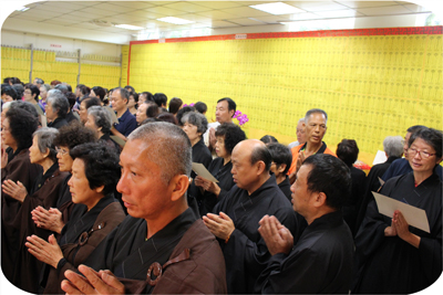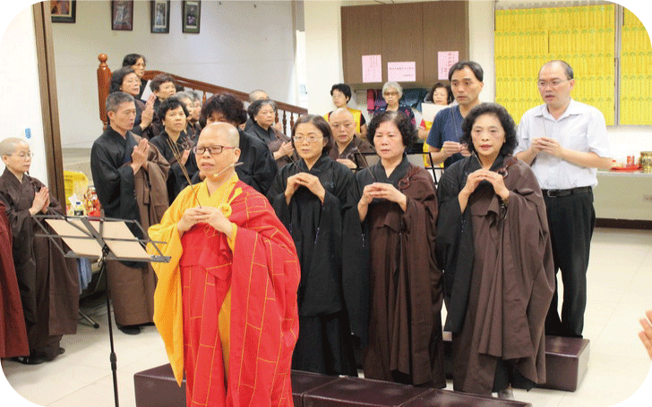 自莊住持於法會開始前,慈悲開示,提醒與會大眾要攝心於法會中,珍惜這個殊勝的法會因緣。於每日上、下午的第一支香,先帶領與會大眾觀修,為現世眷屬、過往先人,及與我們有緣、無緣的眾生祈福。祈請佛光加被,接引先靈到此法會,並觀想自己所超薦的先人一起禮佛求懺,懺除罪業。每每看到住持師父,殷切乞盼的要大家能生起這樣的心來為眾生祈福及拜懺,內心很是感動。法會不只是一場法會而已,它同時具有可以具體呈現的功能,將我們修行的一部分,眼、耳、鼻、舌、身、意六根都運用到,藉由儀軌,而達到淨(靜)心,將心置於一處,以身禮佛、口誦佛、意觀佛,讓身、口、意三業得到淨化。