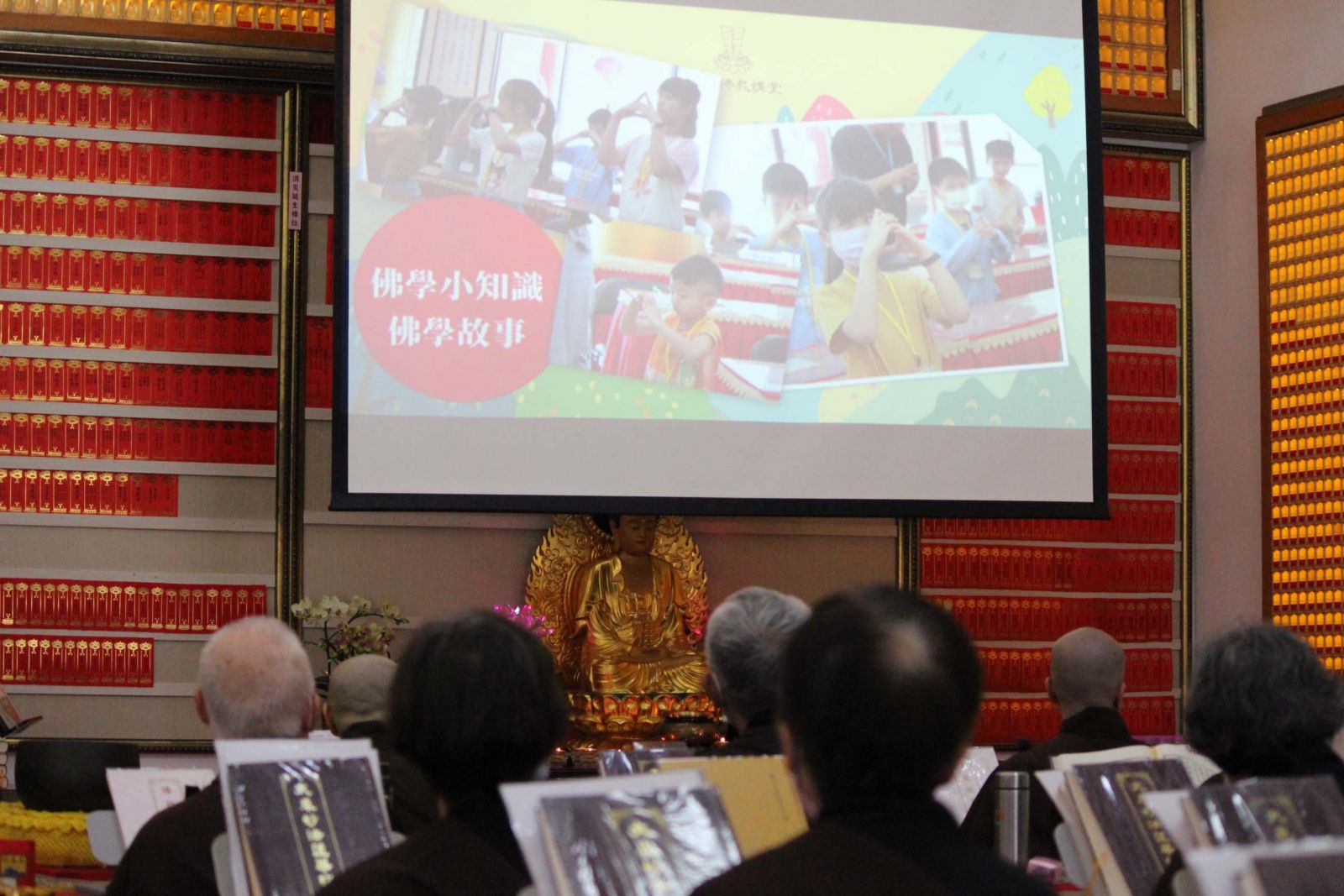 住持首先播放本年度暑期「兒童夏令營」的簡報影片,簡報中我們目睹童年的歡樂與天真無邪。把握孩子還願意膩著父母的時光,讓孩子心裡存下幸福記憶,此是父母給孩子最好的禮物。長大後,會清楚的記得共同擁有的聯繫,實屬一份童年美好佳話,孩子成年後面對生活中各種難題之準備,此份曾經擁有的溫馨經歷,讓孩子在面對挫折或是心裡難受時找到鼓勵和安全感!