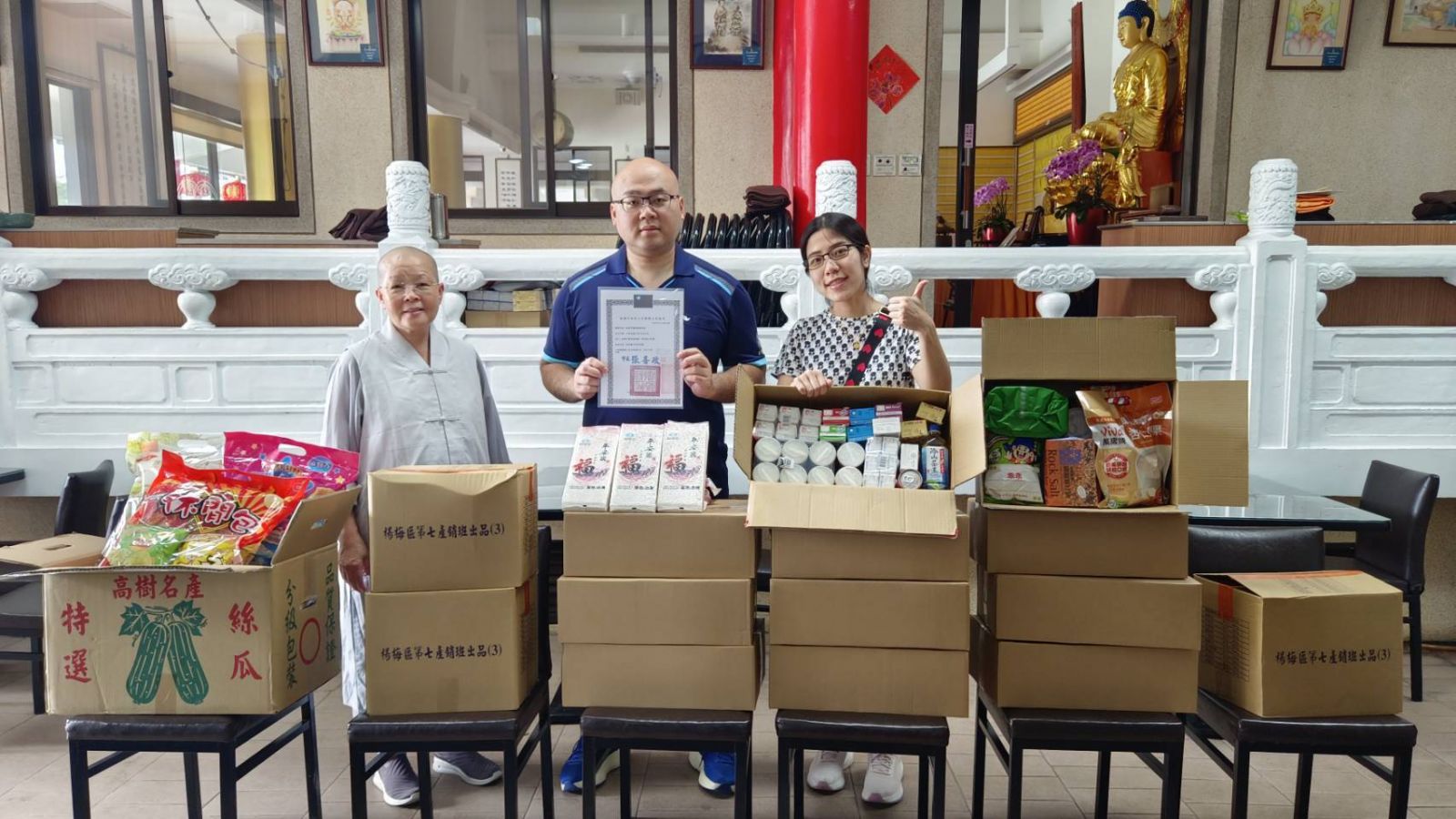 贊助桃園市舞蹈推廣協會物資,米100斤、普施盒10盒、餅乾、飲料,由協會總幹事黄偉倫先生和協會秘書楊惠雯來講堂領取